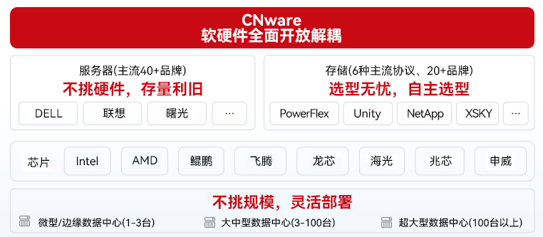 CNware“软硬件解耦 + 一云多芯” 的架构,支持鲲鹏、海光 、飞腾、兆芯、龙芯、申威等国产六大芯片架构,既能纳管现有服务器,也能利旧老旧设备。