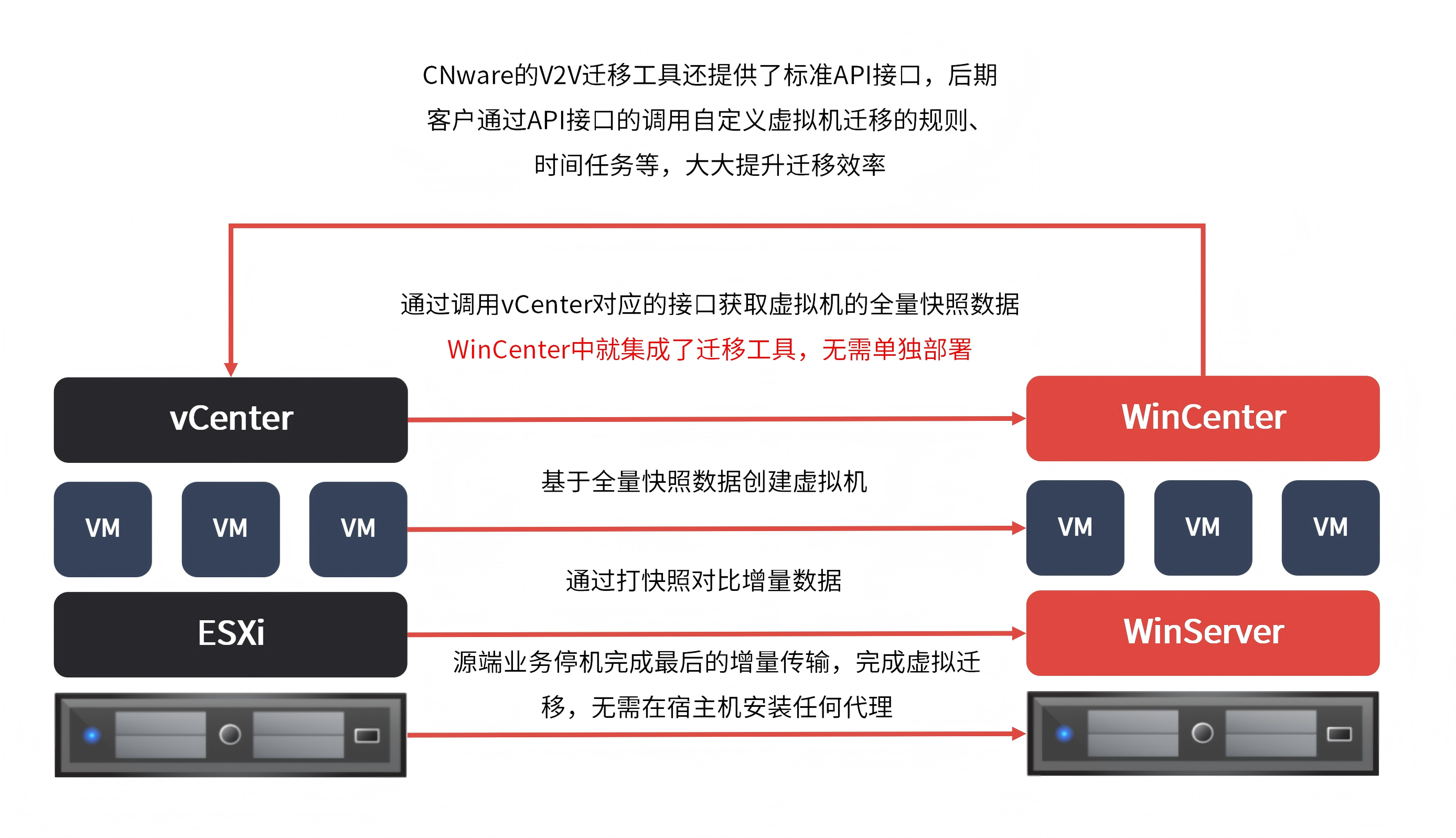迁移过程中的业务中断,是企业替换 VMware 时的重要隐性成本。CNware 通过 “双轨并行 + 热迁移技术”:迁移前,通过统一API接口纳管VMware与 CNware 平台,新旧环境并行运行;迁移中,支持 V2V、P2V热迁移。通过 “全量复制 + 增量同步 + 验证切换”的三步法,企业能有效保障业务的无感知切换,将全程停机时间可压缩至分钟级。这套成熟的 VMware迁移 流程,已在多个行业客户中得到验证。