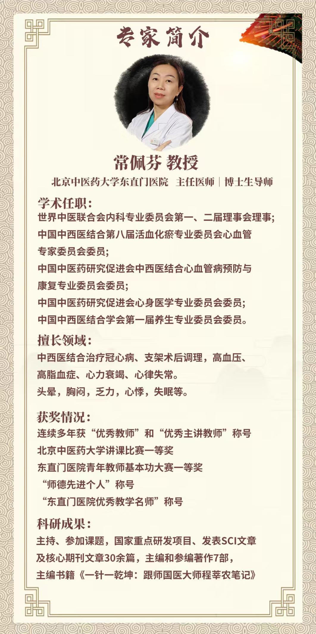 常佩芬毕业于北京中医药大学,从事中医心血管病临床工作 20 余年,现任世界中医药联合会内科专业委员会第一届第二届理事会理事、第三届理事会常务理事。她曾获 “师德先进个人” 等荣誉,这些荣誉的获得,与她在心力衰竭治疗领域的深耕密不可分。